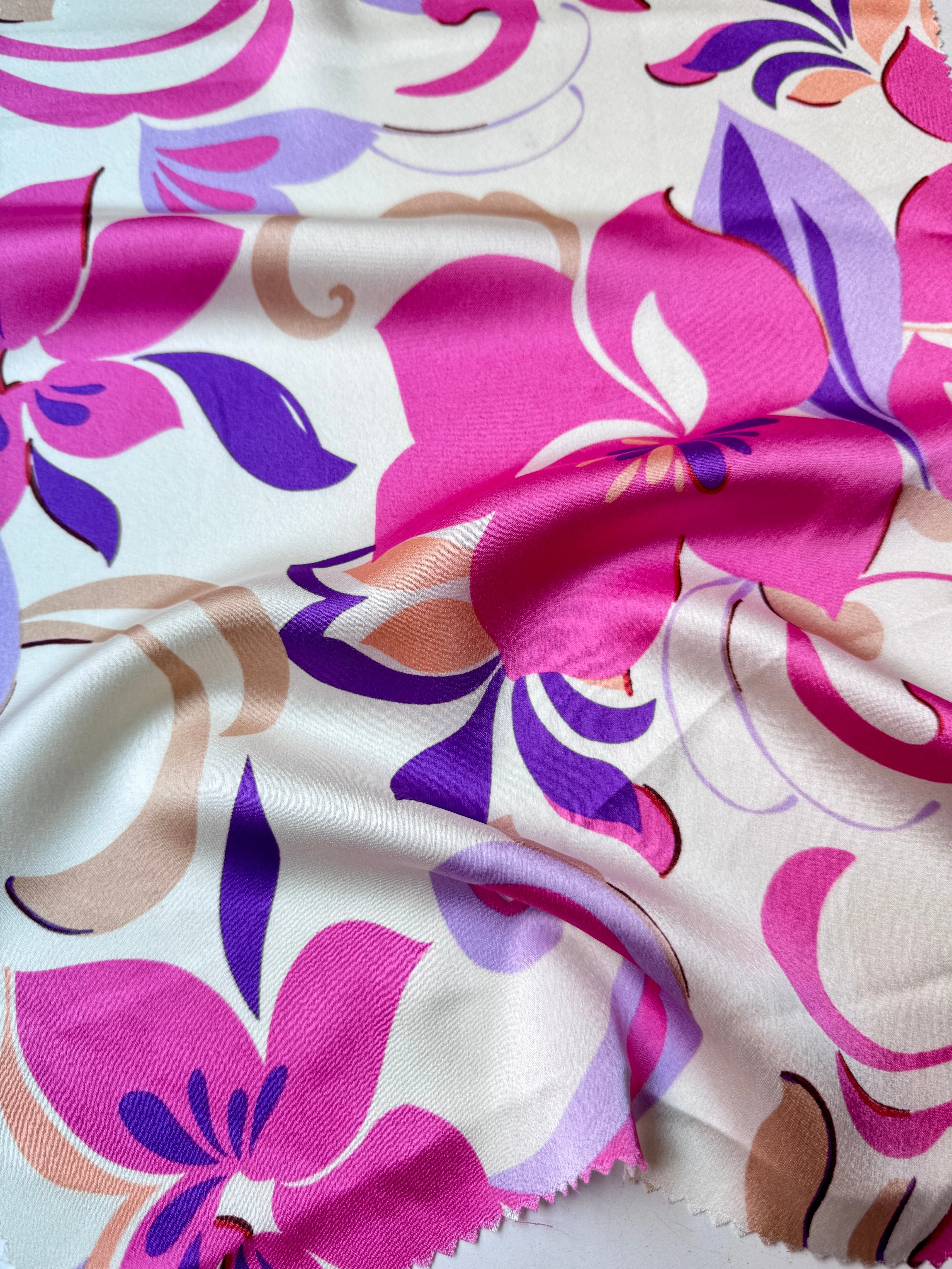 Magic gleams in the shimmering surface of our print satin. Our Kiki"s Exclusive Satin casts a spell on your senses, demanding attention and asking to be crafted into something exceptional. Silken and slick in hand, this satin features a very flowy hand. Mostly opaque, a lining isn't strictly necessary but may be a great addition for structure and a professional finish. Super soft, light weight.